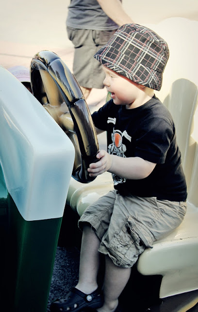 There's this store...and I'll admit...I figured it would be a HUGE waste of time and money...where you can customely build your own vehicle - kindof like a Build-a-Bear for Boys! Anywhos...Trev was dying to do it with Moose. We left it til the end and I was pushing to pass on it because of the level of tiredness...but they did it - and I'm so glad they did. "Monster Mator" as Moose calls him has rarely left his side and he sleeps with him too. He chose which car, he chose to make it into a monster truck, and he loves it. On the way home we asked what his favorite part was, and he said "Monster Mator". So - in the end it was worth it. He got to help build him with the tools. It was all around a good father-son activity! Cute.